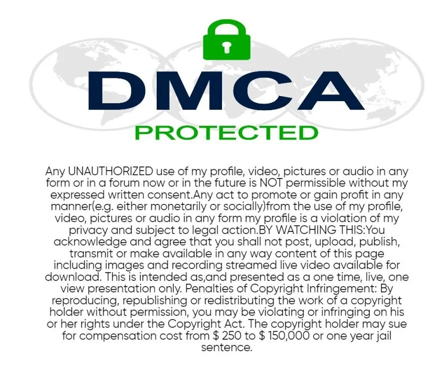 Any Unauthorized use of my profile, video, pictures or media content, in any form, now or in the future is NOT Permissible, without expressed written consent. Any act to promote or gain profit in any manner (e.g. either monetarily or socially) from the use of my profile, videos, pictures or media content in any form from my profile is a violatio'n of my privacy and subject to legal action.
