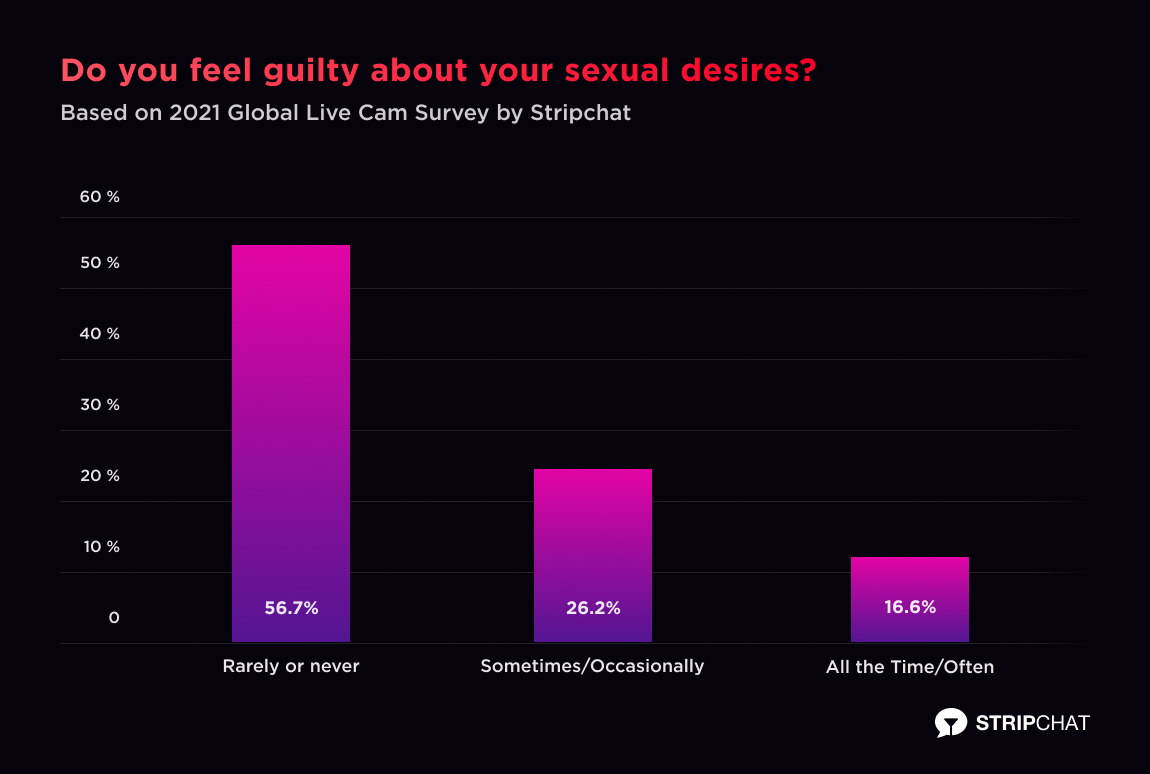 Most LGBTQ+ cam users (57%) said they never (or rarely) felt shame about their sexual desires. That’s pretty much the same percentage we got from heterosexual users. (Bisexuals felt the least amount of shame of anyone. Asexual respondents, endured the most conflict.)