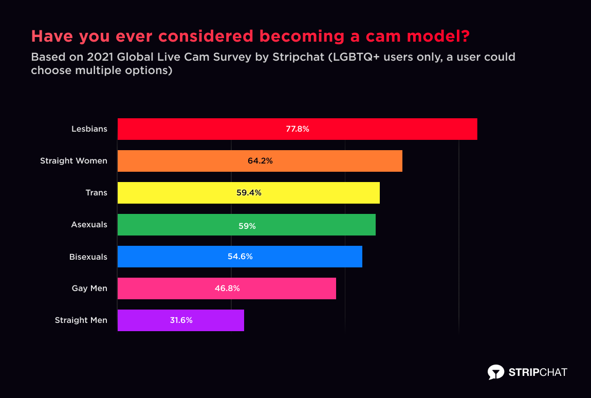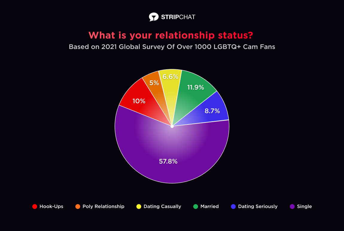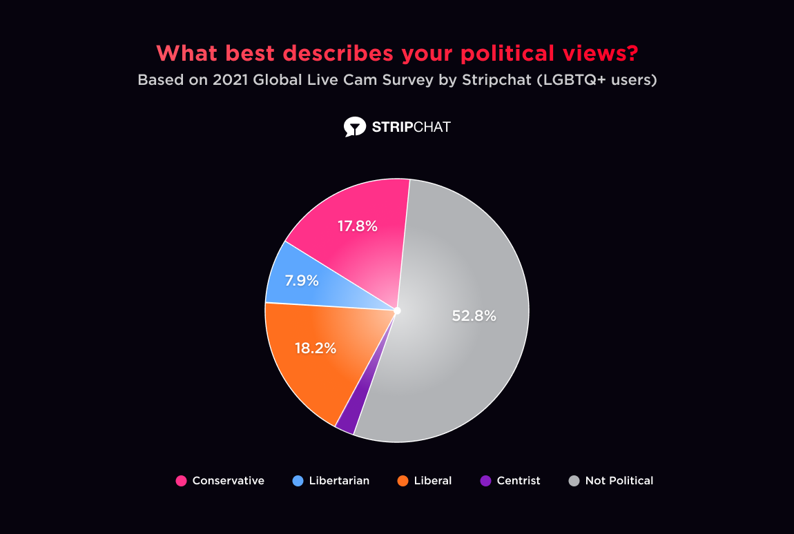 A few weeks ago, we conducted a survey of our US-based Stripchat members to help get to know our LGBTQ+ audience, and better understand what role cams play in their offline lives. It was exciting to see that more than a half of our LGBTQ+ users were considering becoming a cam model. We dove specifically into questions about sexuality, gender identity, relationship status, politics and “outness” in one’s community — and, boy, did we get interesting answers.