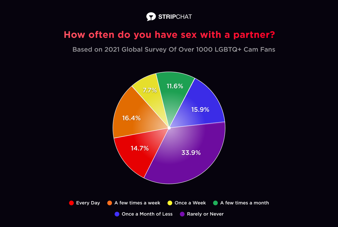 About 15% of our LGBTQ+ members have sex daily with a partner, in addition to their time on Stripchat. Almost 40% are getting laid at least once a week.