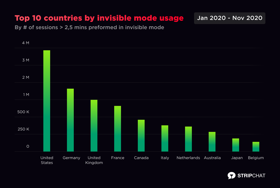 What’s even more exciting is stats showing users who prefer to permanently stay in the role of a spy. They watch public shows anonymously. Users from India being in the top 4 spy shows initiators are not interested in being anonymous at all. Meanwhile, Canadian ‘invisible man’ became a regular visitor to Stripchat following the unexpected appearance of Australians, Japanese, and Belgians in the top 10.