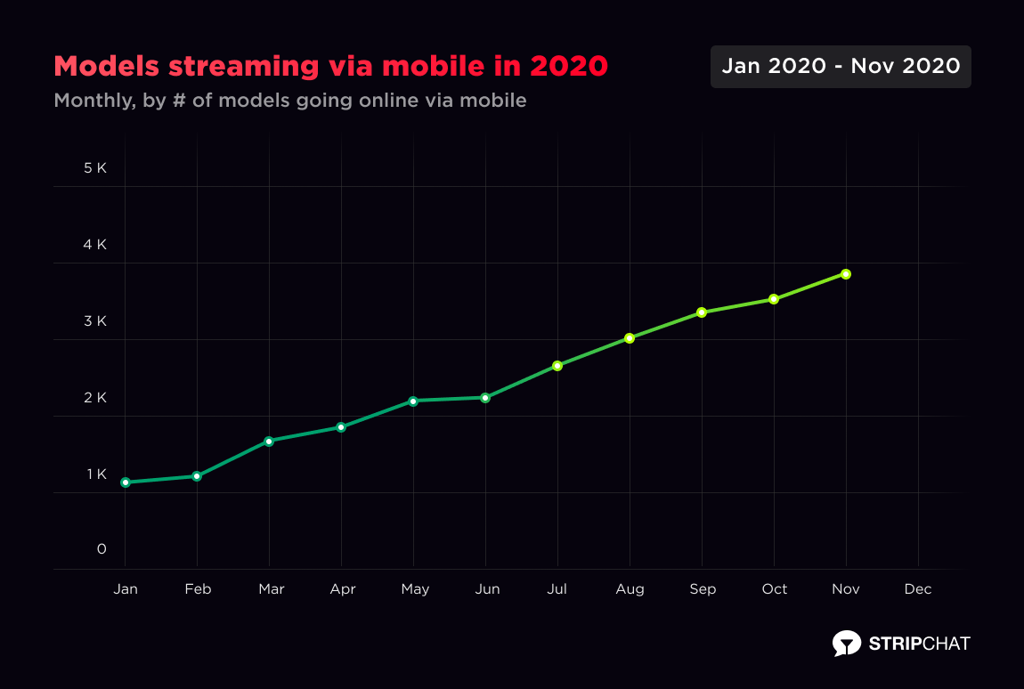 Besides using mobile devices to reach Stripchat, users keep choosing to spend time with models doing mobile broadcasts outside their homes, showing 1724% growth in unique visitors visiting mobile cams from January 2020 to December 2020.
