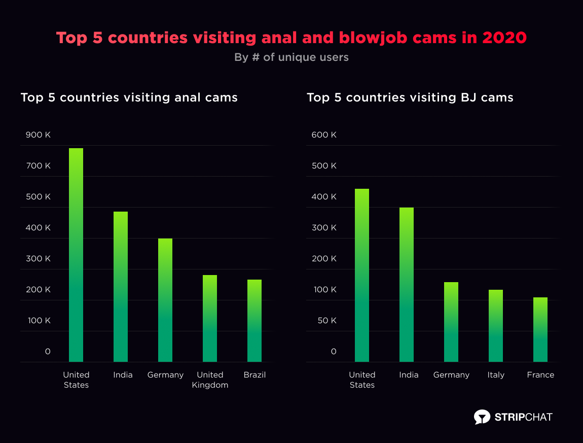 Speaking about new technologies, this year, we also discovered the next best use case for AI. Our team has developed a machine-learning algorithm to identify particular sex acts within the live-streaming video. We’ve called our AI “Anal-ytics” and it analyzes live video as it happens. It allows us to bring live anal and blowjob scenes happening at the very moment to the eyes and hands of our users. In 2020 the total traffic to both categories approximately doubled and we are glad that users from the US, India & Germany gave the best advantage to our new technology but they are also top by traffic; hence, it was expected.