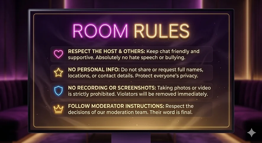 ❌ Don't: No free demands, no disrespect to Sid or Tara, no recording.
